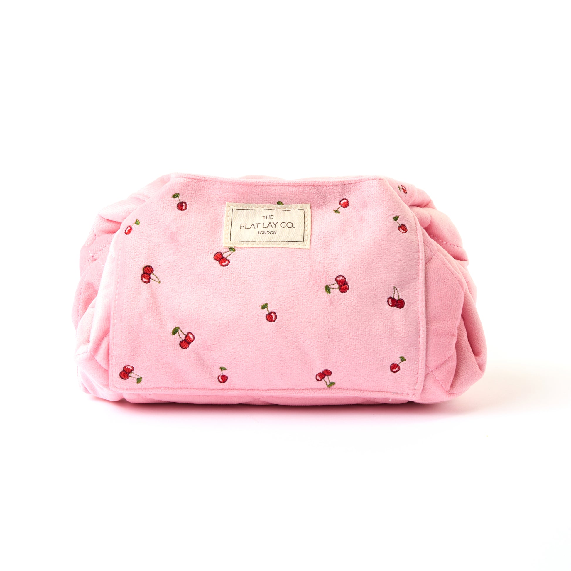 Drawstring Flat Lay Makeup Bag - Ditsy Cherries Pink Embroidered Velvet