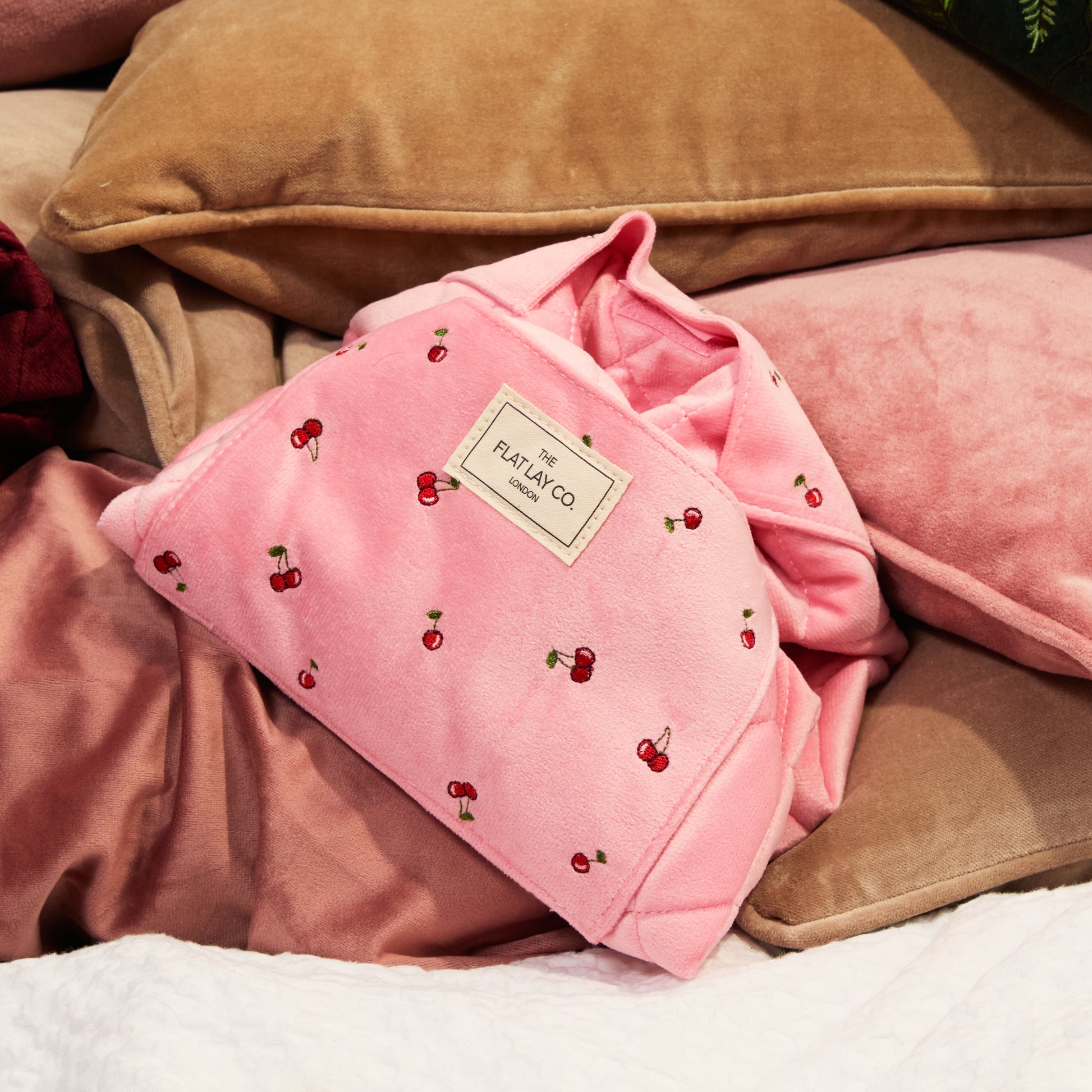 A modern take on velvet - soft pink with a ditsy red cherry print that balances charm with understated luxury.